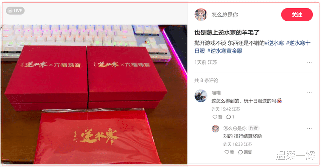 而上述晒黄金的网友,正是“十日服”中的大佬,关服后排行榜位居前三才拿到了这满满一盒黄金的奖励,排名靠后的大佬也有拿到五粮液、金钞等众多丰厚豪礼,要知道《逆水寒》之前可是官宣过,“十日服”中的充值金额将会全部返还到其他服务器,因此相当于白嫖到了这份福利。