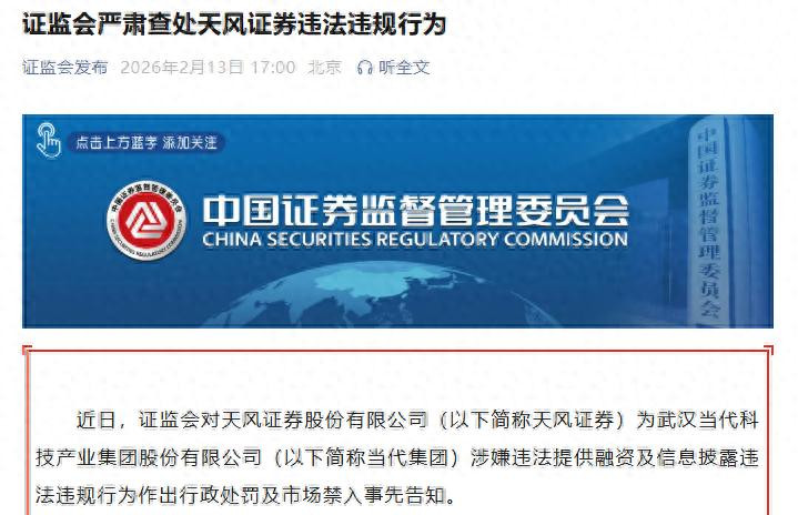 红星成本局2月13日音信,据证监会音信,近日,证监会对天风证券(601162.SH)为武汉现代科技产业集团股份有限公司(以下简称“现代集团”)涉嫌非法提供融资及信息清楚非法违法动作作出行政处罚及市集禁入事前见知。