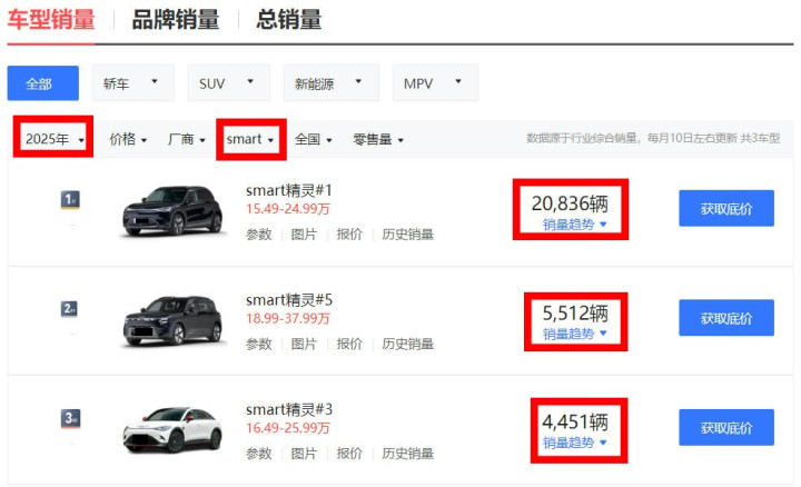 更扎心的是里面的销量结构。撑起这个品牌销量大梁的,照旧阿谁保握了两座小车传统、售价最低的smart精灵#1,它在2025年孝顺了20836辆的零卖销量。而算作“大车化”战术代表的精灵#3和精灵#5,同时的零卖销量折柳仅为4451辆和5512辆,两款大车加起来,还不到初学小车销量的一半。