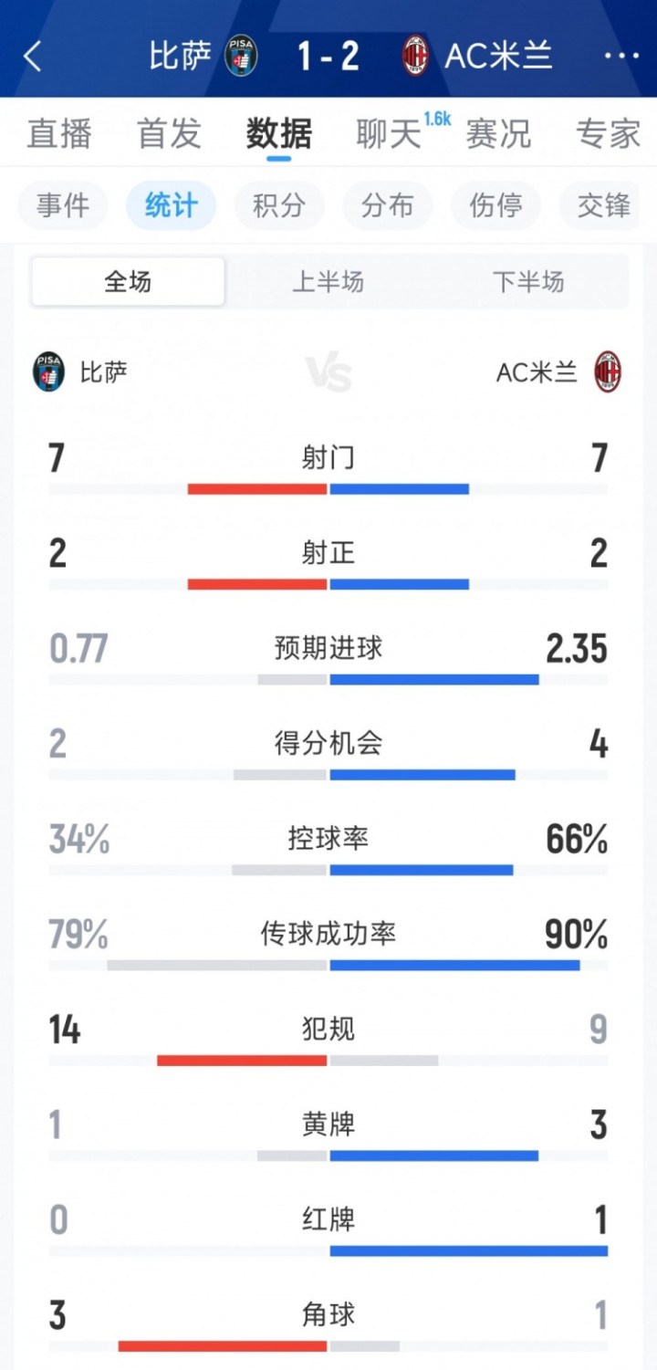 直播吧2月14日讯在本轮意甲,okooo澳客AC米兰2-1打败比萨。以下为两边全场数据对比: