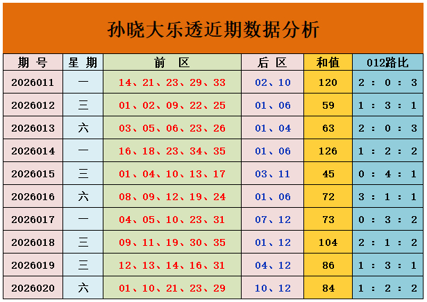 上期总结:大乐透第2026020期奖号:前区01、10、21、23、29,后区10、12,前区奖号和值为84,012路比为1:2:2,后区开出大大组合10、12