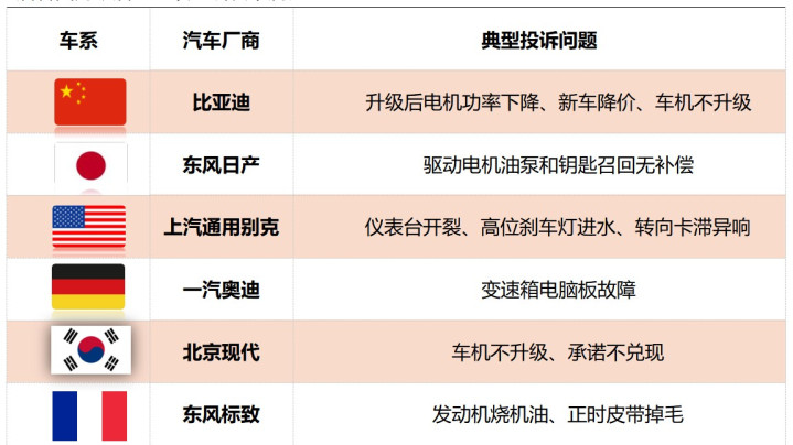 二、从投诉车企来看,TOP10中比亚迪出现新的想到投诉,多车因升级后电机功率下落引起车主不悦。东风日产位列第二,运行电机油泵与钥匙调回无补偿是主要槽点。上汽通用别克排行第三,姿色台开裂、高位刹车灯开裂、转向卡滞异响仍然是主要槽点。