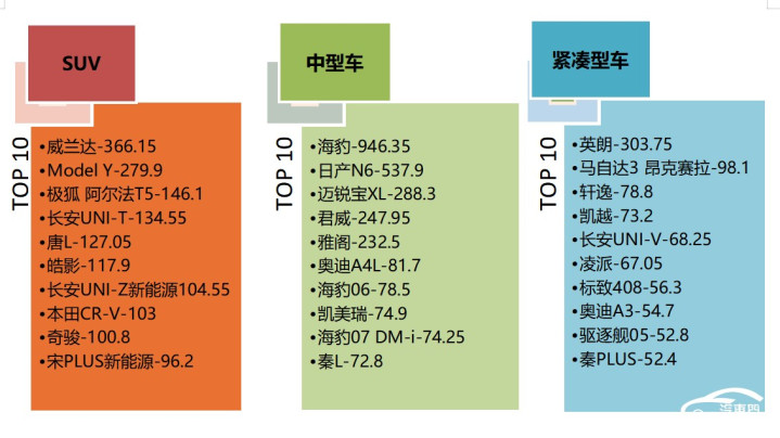 从车型漫步来看,SUV仍然是投诉指数占比最高的品类。威兰达、Model Y、极狐 阿尔法T5组成SUV榜单前三,投诉指数均涨超2倍以上。紧随后来的是中型车,遭受想到投诉的海豹、日产N6、迈锐宝XL等车型成了幕后推手。紧凑型车位列第三,其中英朗重回榜首投诉指数环比飞腾了292.44%。