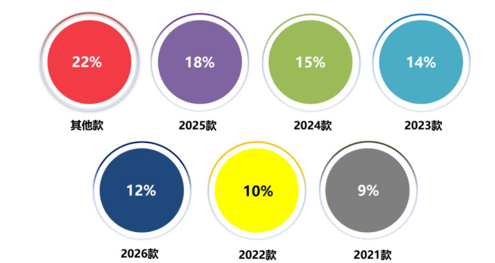 五、从车型年款来看,六年以上的老车、2025款、2024款是主要投诉源,投诉指数占比达到了54%。具体来看,六年以上的老车投诉占比第一,投诉点主要想到在英朗、迈锐宝XL、君威三款车型上。。2025款车型投诉占比18%,Model Y减震器异响和唐L闪充职权区别对待是被投诉最多的问题。海豹是2024款车型投诉的“重灾地”发动机功率不及激发想到投诉。