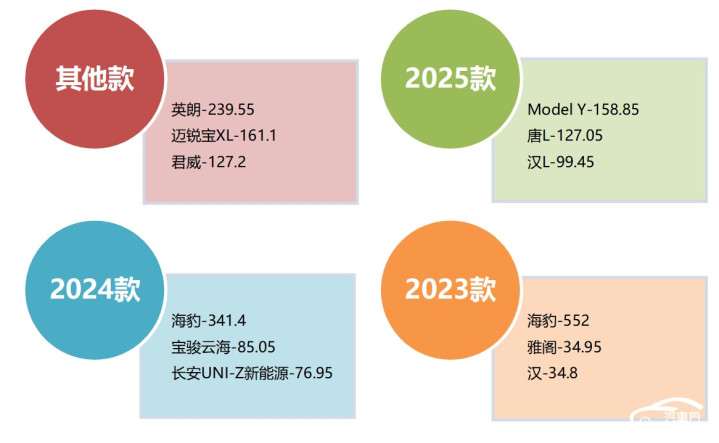 从车型年款来看,六年以上的老车、2025款、2024款是主要投诉源,投诉指数占比达到了54%。具体来看,六年以上的老车投诉占比第一,投诉点主要想到在英朗、迈锐宝XL、君威三款车型上。2025款车型投诉占比18%,Model Y减震器异响和唐L混动和纯电兆瓦闪充职权区别对待是被投诉最多的问题。海豹是2024款车型投诉的“重灾地”,发动机功率不及引起车主不悦。
