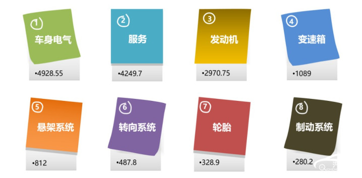投诉指数:汽车门网全新构建汽车投诉指数经营模子(简称:QCMS),将车型质地投诉分为八大类,凭据发动机、变速箱、车身及电气、制动系统、转向系统、吊挂系统、轮胎、就业等问题影响严重性分辩赋权,并对想到性事件稀疏加权,最终酿成灵验投诉指数,指数越大越严重。