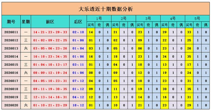 上期追念:大乐透第2026020期奖号为:前区01、10、21、23、29,后区10、12,前区奖号和值为84,后区开出大大组合10、12
