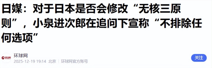 1.《日媒:对于日本是否会修改“无核三原则”,小泉进次郎在追问下声称“不排斥任何选项”》2025-12-19 19:14 | 开始:环球网