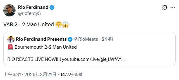 直播吧03月21日讯英超第31轮,10东说念主曼联客场2-2战平伯恩茅斯,本场比赛的判罚激发争议。赛后,费迪南德盛怒发文:“VAR2-2曼联”。