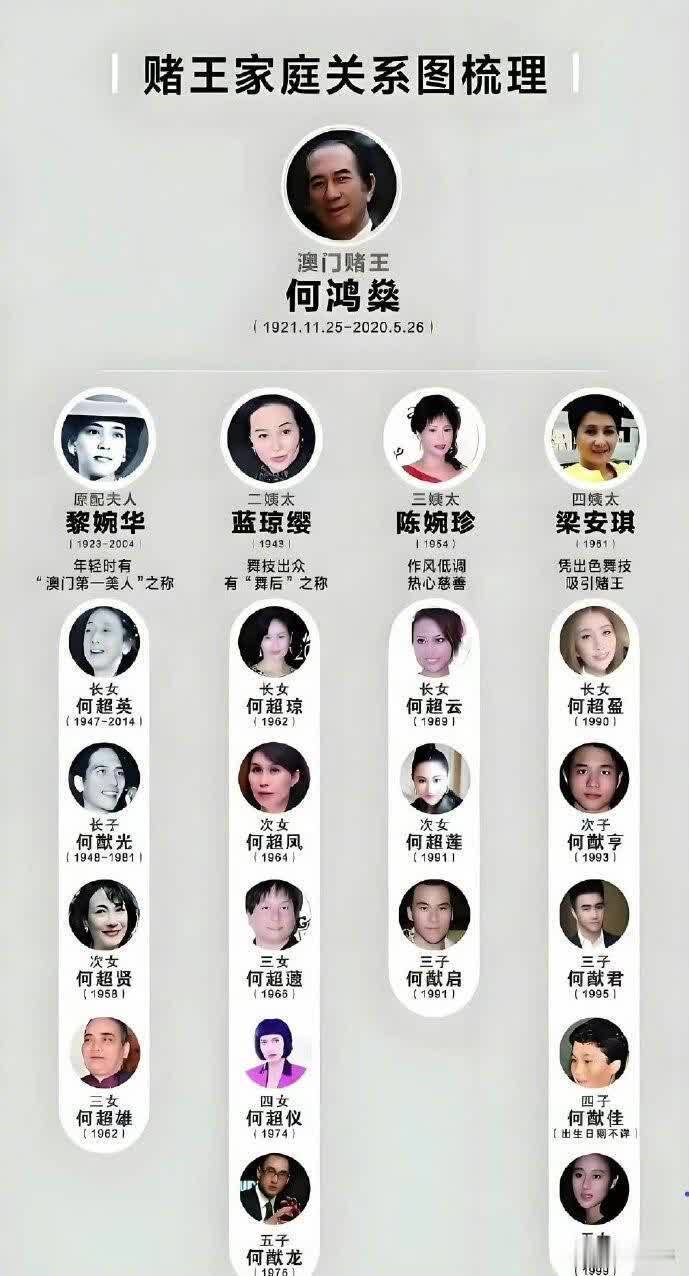 赌王眷属发布讣告,赌王何鸿燊与二太蓝琼缨的第三个女儿何超蕸因病离世,享年60岁。