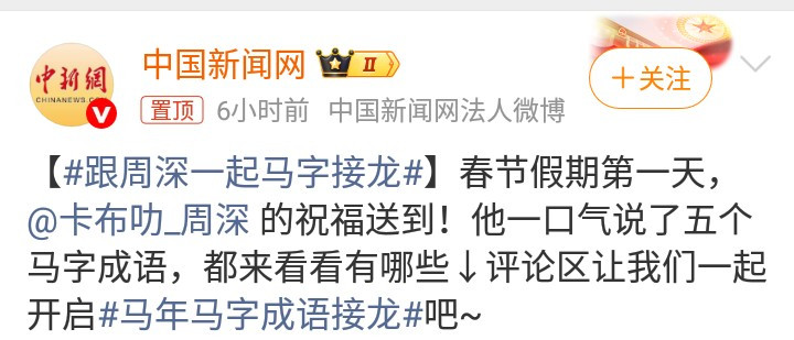 周深如故屡次登上央视春晚舞台上演,带来了好多感东谈主至深的上演!那么,这一次马年春晚,歌手周深依旧让东谈主期待! 中国新闻网在外交平台发文:春节假期第一天,周深的祝颂送到! 周深用五个马字的谚语,祝颂不雅众一又友春节景象!这就是优秀歌手的高文化脉络体现!