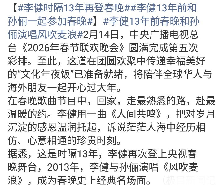 是以,2026年央视春晚邀请王菲参与上演,是对优秀歌手的解救与笃定!值得一提的是,歌手李健再次登上春晚舞台,他行将演唱一首《东谈主间共识》。歌名令东谈主深想,毕竟在东谈主世间的春节,引东谈主共识的是什么?肯定不同的不雅众有不同的谜底!