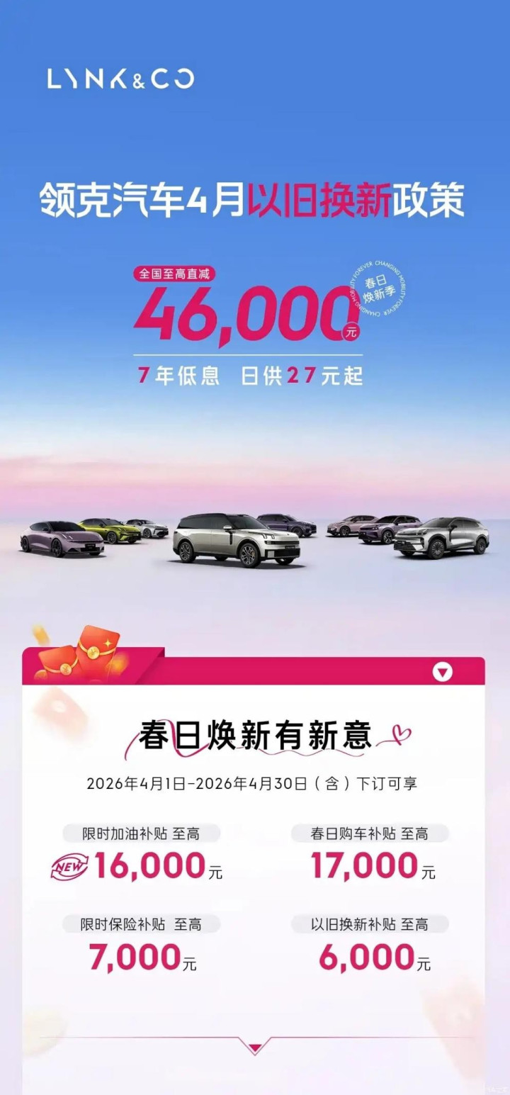 4月份,领克推出“以旧换新”促销季(4月1日-4月30日),全系至高直降4.6万元,重叠7年低息、日供27元起。但仔细拆解各车型补贴后你会发现:力度严重分化。有的车补贴堆满,号称“价钱屠户”;有的车仅仅标记性让利,不值得为它故意跑一回。底下我就来给公共简易地解读下。