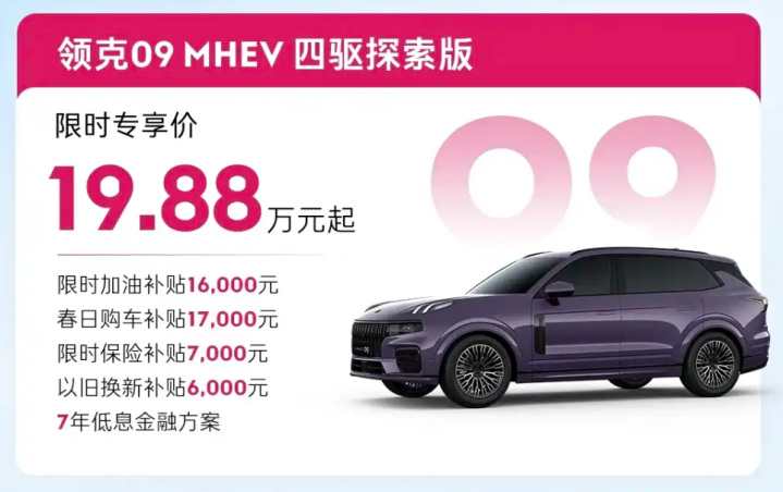 本体仅春日购车补贴20,000元 + 以旧换新6,000元,共计2.6万元。莫得加油补贴、莫得保障补贴。比较燃油版09 MHEV的4.6万概括让利,插混版反而“缩水”彰着。除非你非绿牌不买,不然同门燃油版更合算。