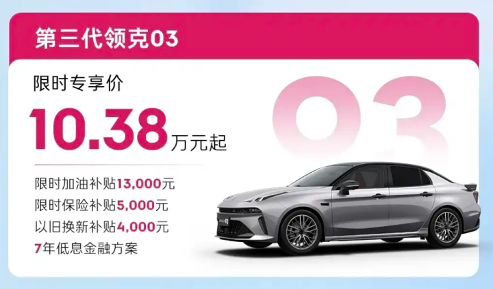 第三代领克03(10.38万起):加油13000+保障5000+置换4000,共计2.2万,燃油轿车里的放心遴荐。