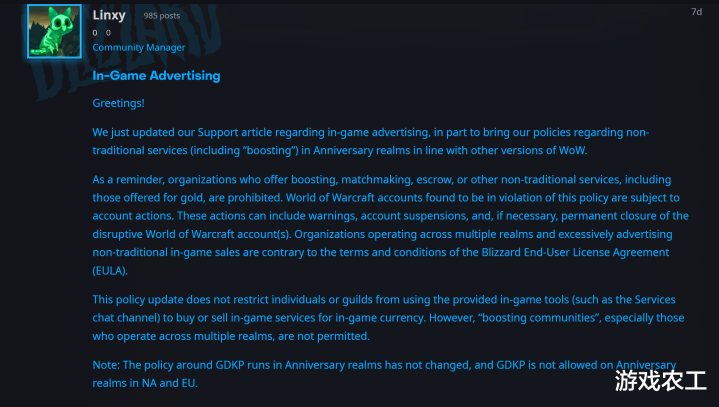 最后一点,魔兽世界怀旧服重申GDKP周年服务器运行的政策没有变化,且在北美和欧盟的周年服务器上不允许使用GDKP。所以暴雪针对于金团的打压力度本身没有任何改变,只是说针对于排骨人释放了一些好处,更准确地说是将排骨人给合法化了,而不是一直将排骨人和工作室混为一谈。不过明确打击了工作室,所以对于排骨人来说是一个好消息。