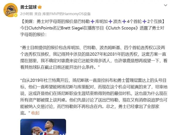 而本次最让人关注的交易窗口,自然就是围绕雄鹿核心扬尼斯·阿德托昆博的流言,流言显示字母哥和雄鹿两方已经达成分手共识,但这份分手不是即刻就要发生,而有可能推迟到休赛期,不管是不是板上钉钉的事,字母哥的动向都让不少球队虎视眈眈,热火、尼克斯、森林狼还有勇士队都被牵扯进来,勇士队在这其中表现得最为积极。