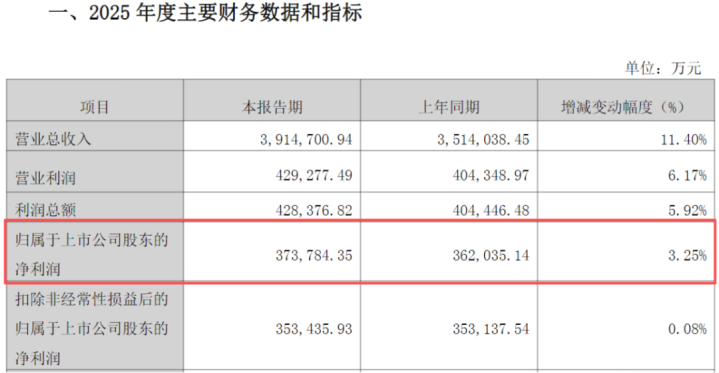 公司全年营收同比增长11.40%,看似慎重,但归母净利润险些持平。更值得海涵的是,从2025年半年报、三季报到功绩快报,其利润增速从57%,降至22%,再降仅0.08%,出现断崖式下滑。