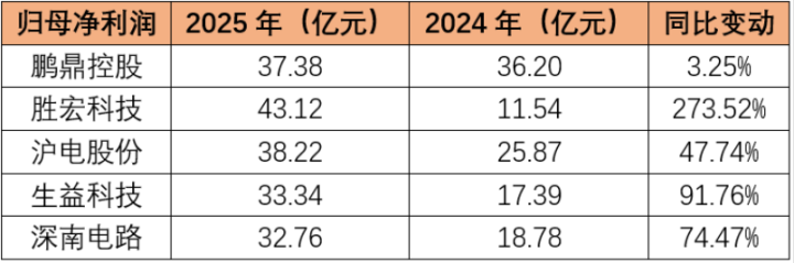 在还是线路年报数据的PCB头部厂商中,鹏鼎控股的利润增速垫底,2025年的归母净利润已被胜宏科技(300476.SZ)、沪电股份(002463.SZ)反超。